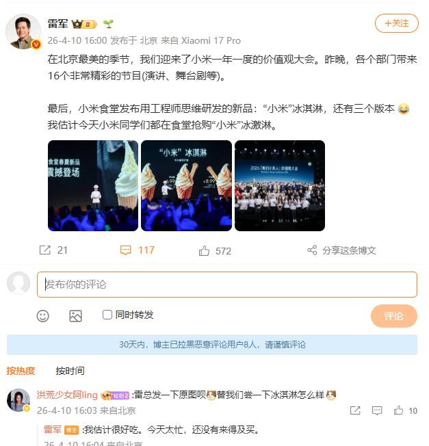 4月9日晚,在小米2026价值不雅大会上,小米食堂推出新品“小米”冰淇淋。