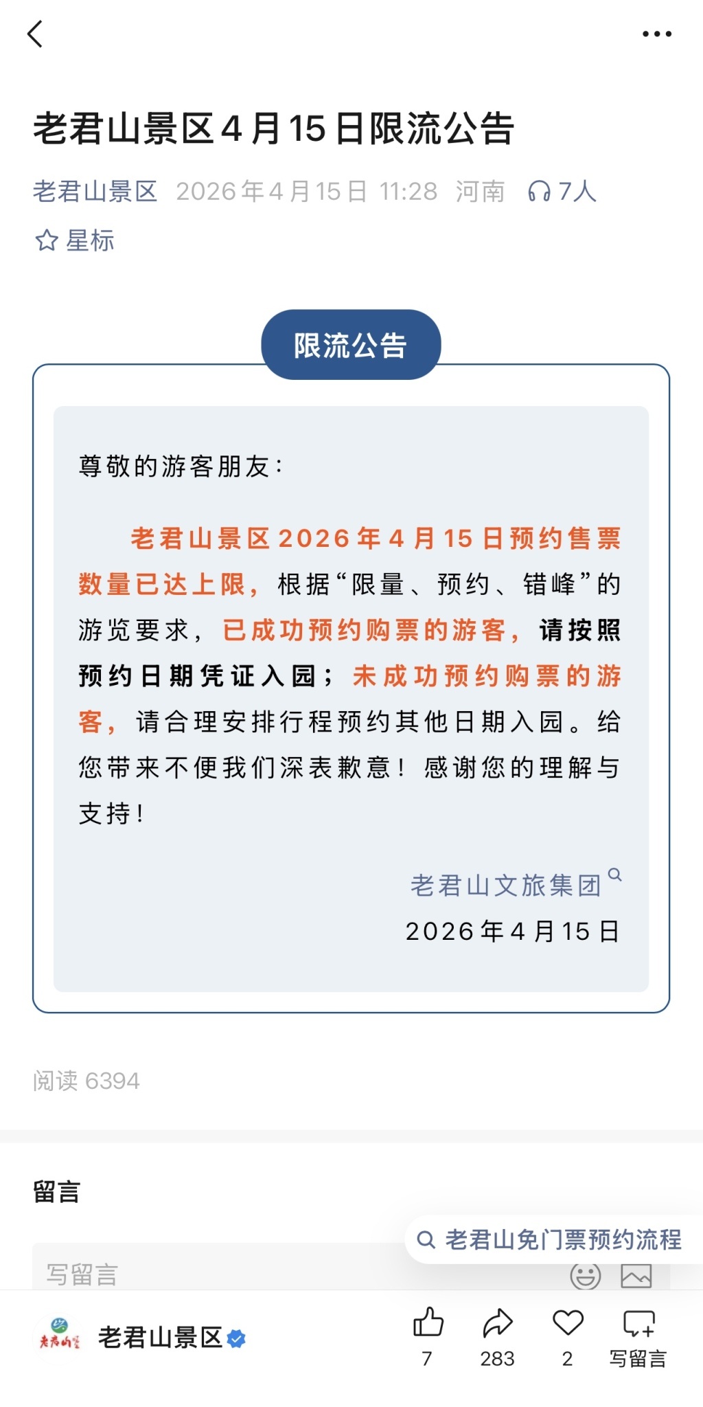 4月15日,一个“平平无奇”的职责日,中午11:28,老君山景区发布限流公告称,景区预约售票数目已达上限,根据“限量、预约、错峰”的游览条目,已凯旋预约购票的搭客可按照预约日历根据入园;未凯旋预约购票的搭客预约其他日历入园。