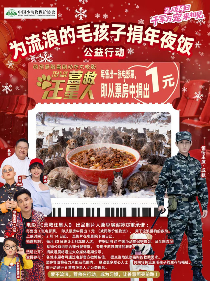 萌宠悬疑喜剧动作合家欢电影《营救汪星人》也宣布2月14日重映,除了情人节档,它显然也打算加入春节档,因为这片子发起名为“为流浪毛孩子捐年夜饭”的公益行动,将观影消费转化为切实的公益力量:自2月14日上映起至影片在电影院下映日止,每售出一张电影票,即从票房中捐出1元(或同等价值物资),用于全国范围内流浪猫狗的救助工作。为这些漂泊无依的毛孩子,送上一份兼具暖意与希望的“新春年夜饭”,有点“名”副其实。