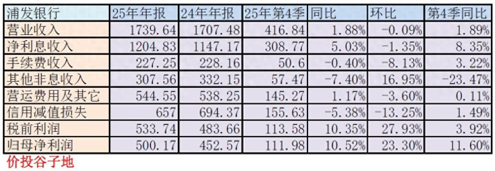 字据2025年年报,浦发银行营收1739.64亿,同比增长1.88%。净利息收入1204.83亿,同比增长5.03%。非利息收入中手续费收入227.25亿同比下降0.4%。归母净利润500.17亿同比高潮10.52%。更多的数据如下表1所示: