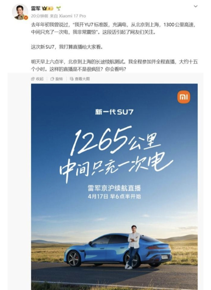 雷军特意为此显现了“1300公里只充一次电”的说法。在雷军的发文中,也曾明确说了充满电,从北京到上海中间只充一次电。成果,有网友拿这句话作念著作,诬告雷军的真理,说雷军夸小米汽车1300公里只充一次电。