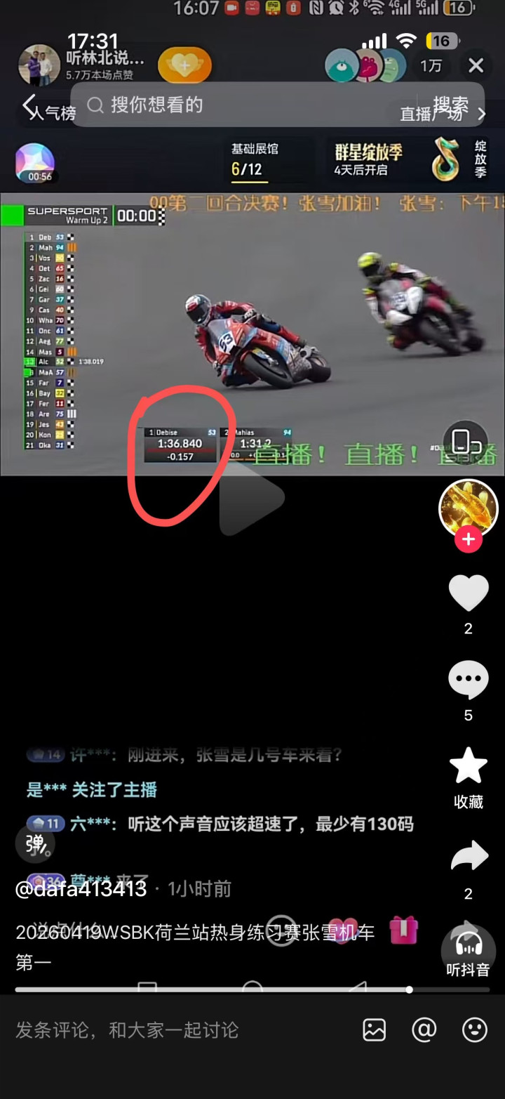 在4月19日的荷兰站第二回合热身赛中,张雪机车53号车手取得第别称获利。直播截图