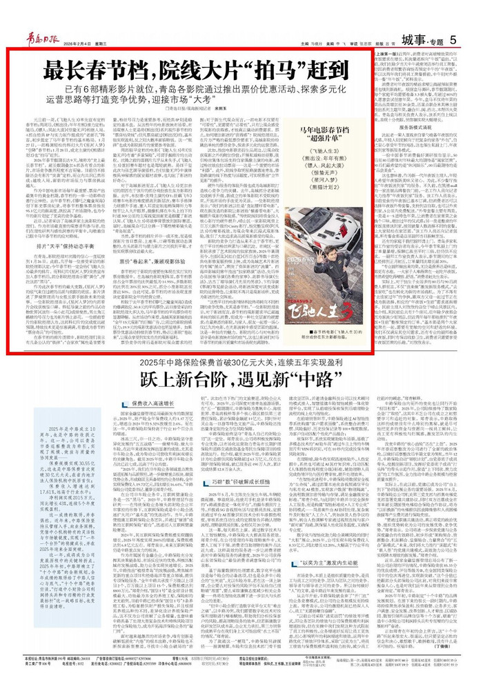 “这些平日的电影情结积淀终将转向不同档期的竞争优势,尤其是春节档。”一位影院经理表示,对于影迷而言,春节档的观影需求早已超越单纯的娱乐消费,而成为一种社交层面的硬需求:在最熟悉的影院,与家人、朋友一起看一场心仪已久的电影,在光影流转中感受团圆的温暖,这是一种独有的魅力。影院的用心与对电影的坚守是电影放映市场的底气,这也让影迷们对马年春节档的影片质量和市场表现充满期待。(青岛日报/观海新闻记者米荆玉)
